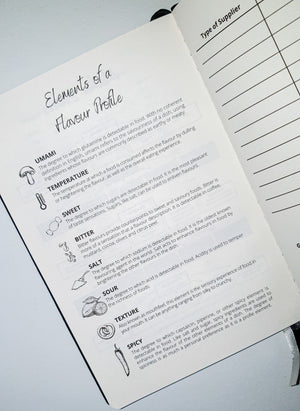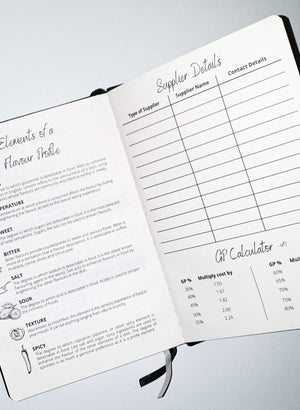 This journal is leather bound and each page is printed on high quality paper. It has been ruled one side for recipe notes and blank the other for dish design.